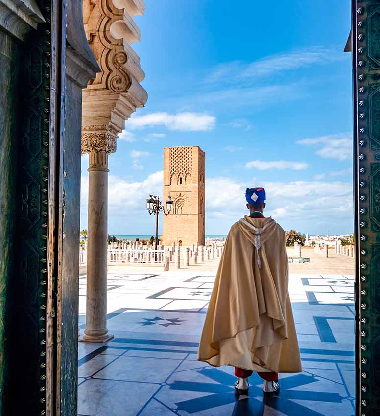 Tras admirar el conjunto, pondremos rumbo a Rabat, la capital del país, que tiene esta consideración desde 1912. Eso le ha dado el derecho a formar parte de este circuito por las Ciudades Imperiales de Marruecos, pero también sus importantes monumentos histórico-artísticos. Por ejemplo, la Torre Hassan, una obra maestra del periodo almohade que, por ello, guarda un gran parecido con la Giralda de Sevilla. O la kasbah de los Oudayas, gran recinto amurallado desde el que se tiene una magnífica panorámica de la desembocadura del río Bu Regreg, de la vecina Salé y de las populosas playas situadas aquí.