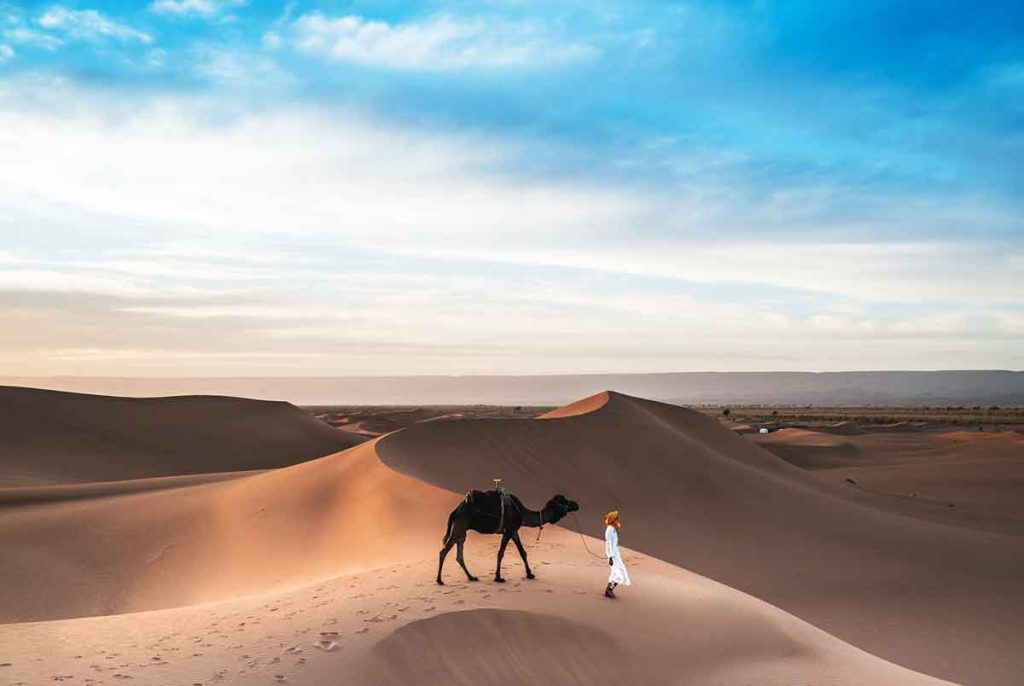 - Llegada a Merzouga. Excursión en dromedario (o 4×4) por las dunas de Erg Chebbi