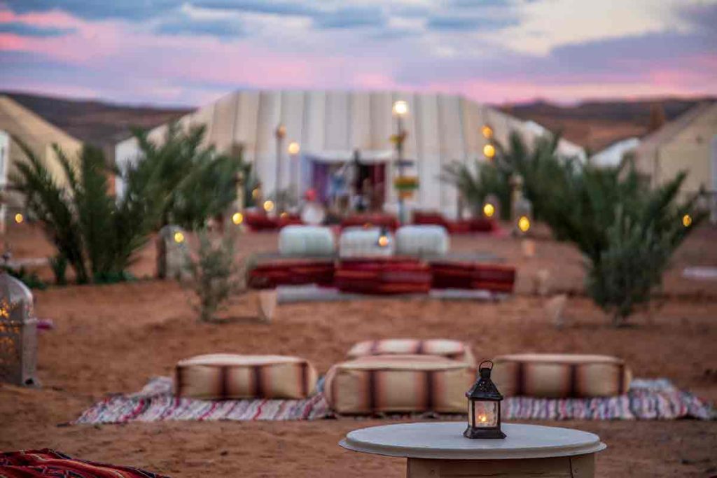 A la caída de la noche, se abrirá sobre nuestras cabezas un espectáculo difícil de ver en otros lugares del mundo: un cielo refulgente de estrellas gracias a la nula nubosidad y a la inexistente contaminación lumínica. Tras ello, en el campamento se servirá la cena y se hará noche, dentro de tiendas tradicionales al estilo de los nómadas del desierto, pero con todas las comodidades.
