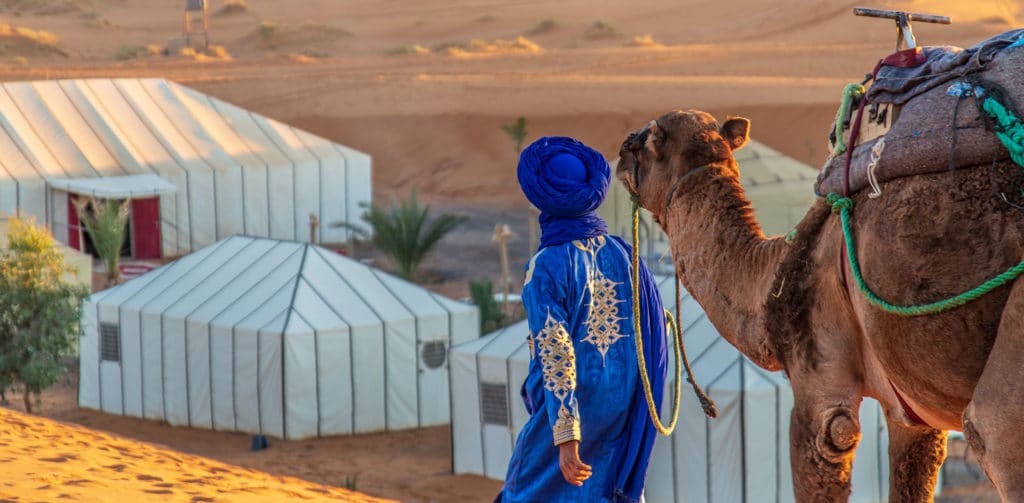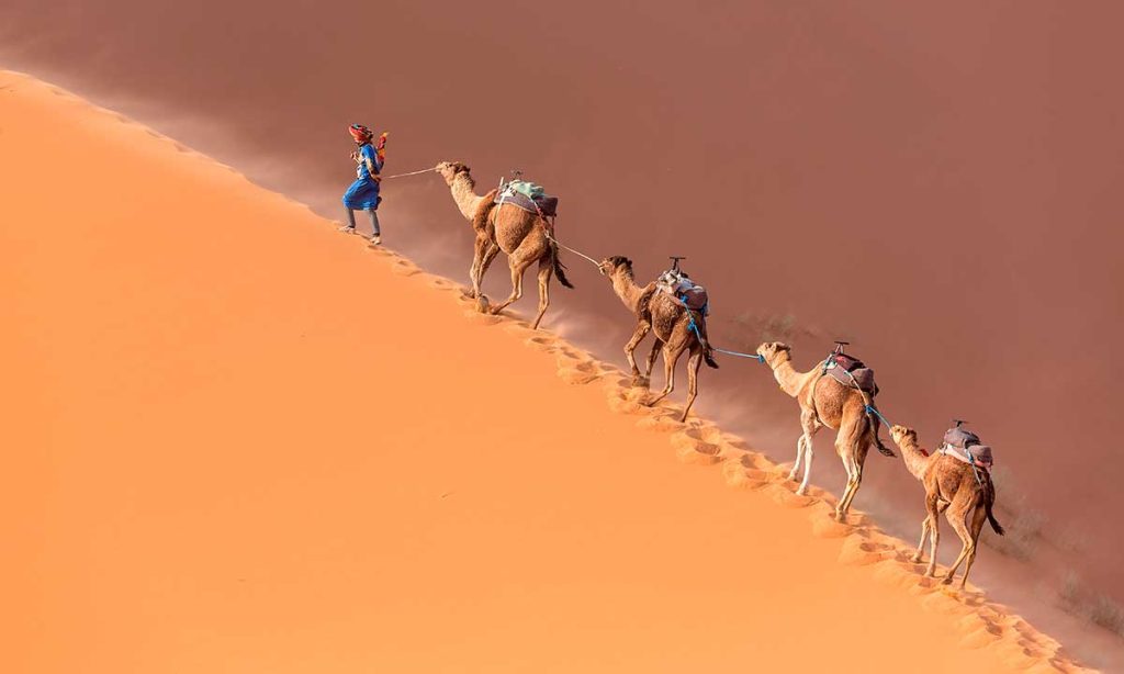 - Llegada a Merzouga: excursión en dromedario a Erg Chebbi